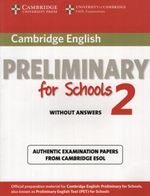Cambridge English Preliminary for Schools 2 contains four complete and authentic examination papers for Cambridge English: Preliminary for Schools PET for Schools . This collection of past examination papers is aimed at a young audience, and provides the most authentic exam preparation available. These past papers allow candidates to familiarise themselves with the content and format of the examination and to practise useful examination techniques. Audio CDs containing the exam Listening material, a Student's Book with answers, and a Self-study Pack containing the Student's Book with answers and Audio CDs are available separately.